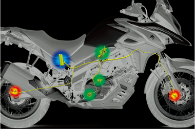 Το Suzuki Traction Control System παρακολουθεί συνεχώς την ταχύτητα περιστροφής του εμπρός και πίσω τροχού, τον αισθητήρα θέσης γκαζιού, τον αισθητήρα θέσης στροφαλοφόρου και τον αισθητήρα σχέσης στο κιβώτιο, και μειώνει άμεσα την απόδοση του κινητήρα όταν ανιχνευθεί ολίσθηση του τροχού. Η απόδοση του κινητήρα ελέγχεται μέσω της διαχείρισης του χρονισμού ανάφλεξης και της παροχής αέρα, ώστε να εξασφαλίζεται πιο ομαλή λειτουργία του συστήματος ελέγχου πρόσφυσης. Ως αποτέλεσμα, ο αναβάτης μπορεί να απολαμβάνει ταξίδια μεγάλων αποστάσεων με μεγαλύτερη άνεση, μειωμένο στρες και λιγότερη κόπωση.